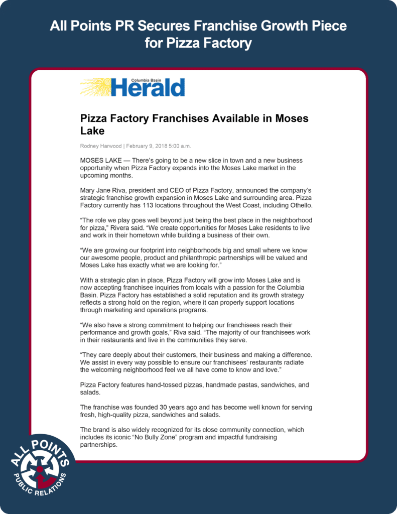 All Points PR Secures Franchise Growth Piece for Pizza Factory