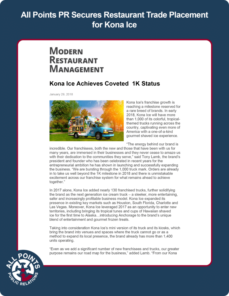 All Points PR Secures Restaurant Trade Placement for Kona Ice