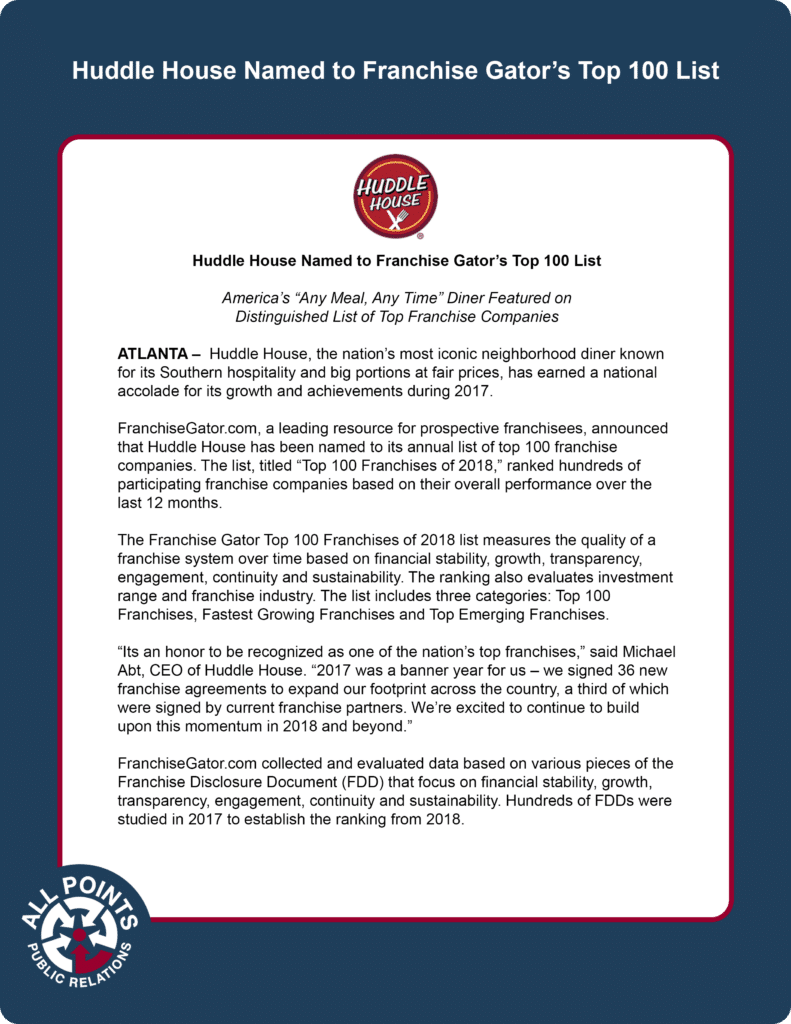 Huddle House Named to Franchise Gator’s Top 100 List