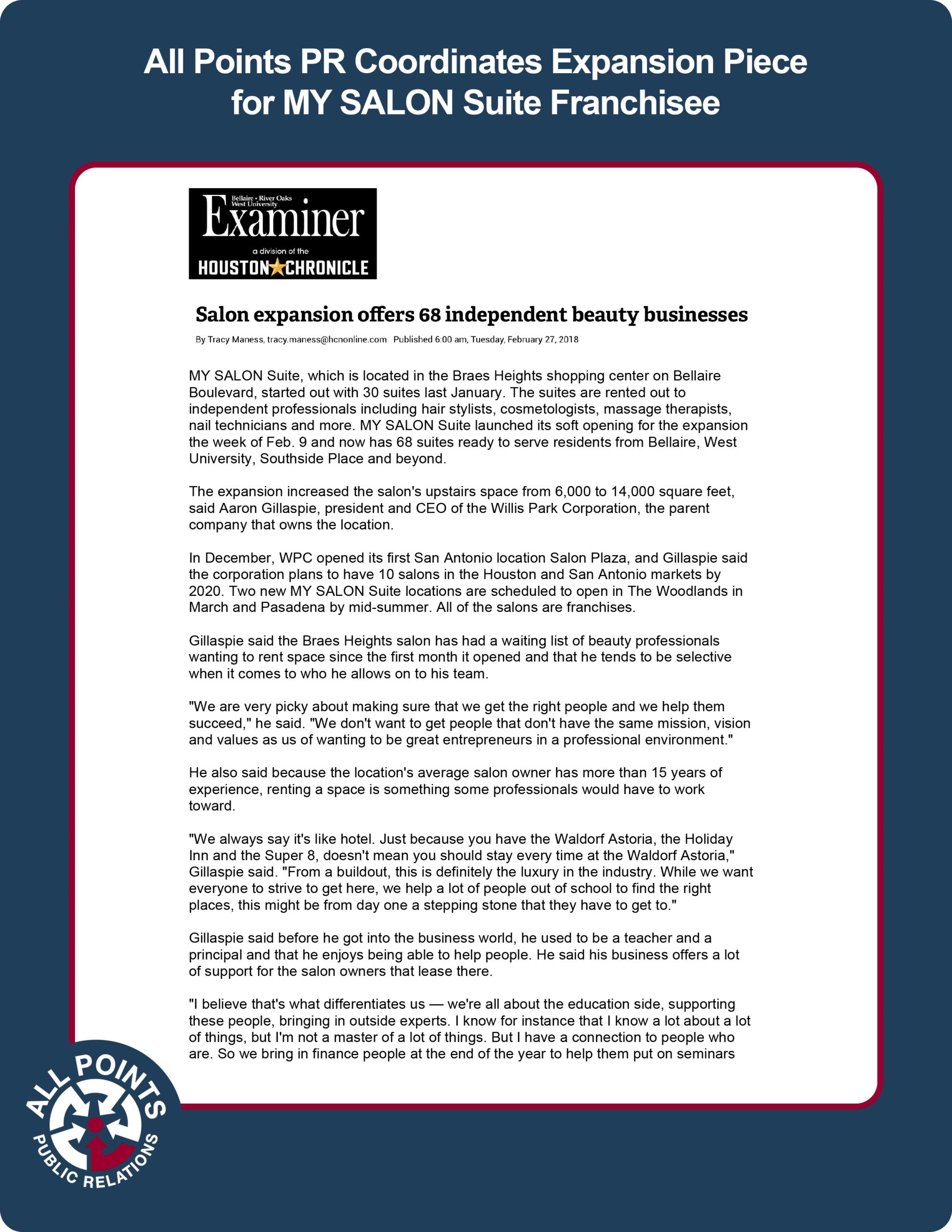 All Points PR coordinated a placement in the Bellaire Examiner for client MY SALON Suite and its recent expansion in Houston. Coverage ran online.