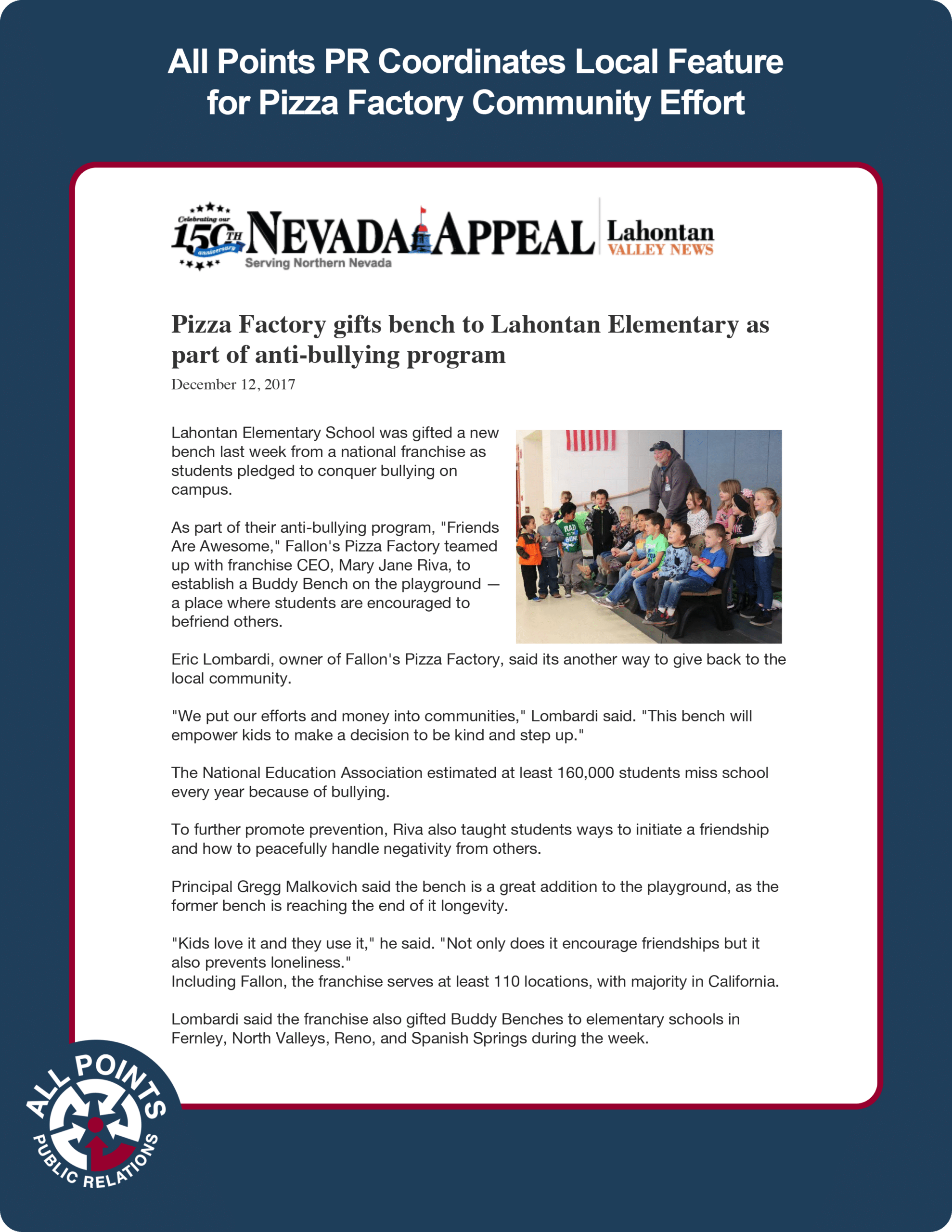All Points PR coordinated a feature in the Nevada Appeal for client Pizza Factory and its most recent gift – a bench to a local elementary school as part of an anti-bullying program. Coverage ran online.