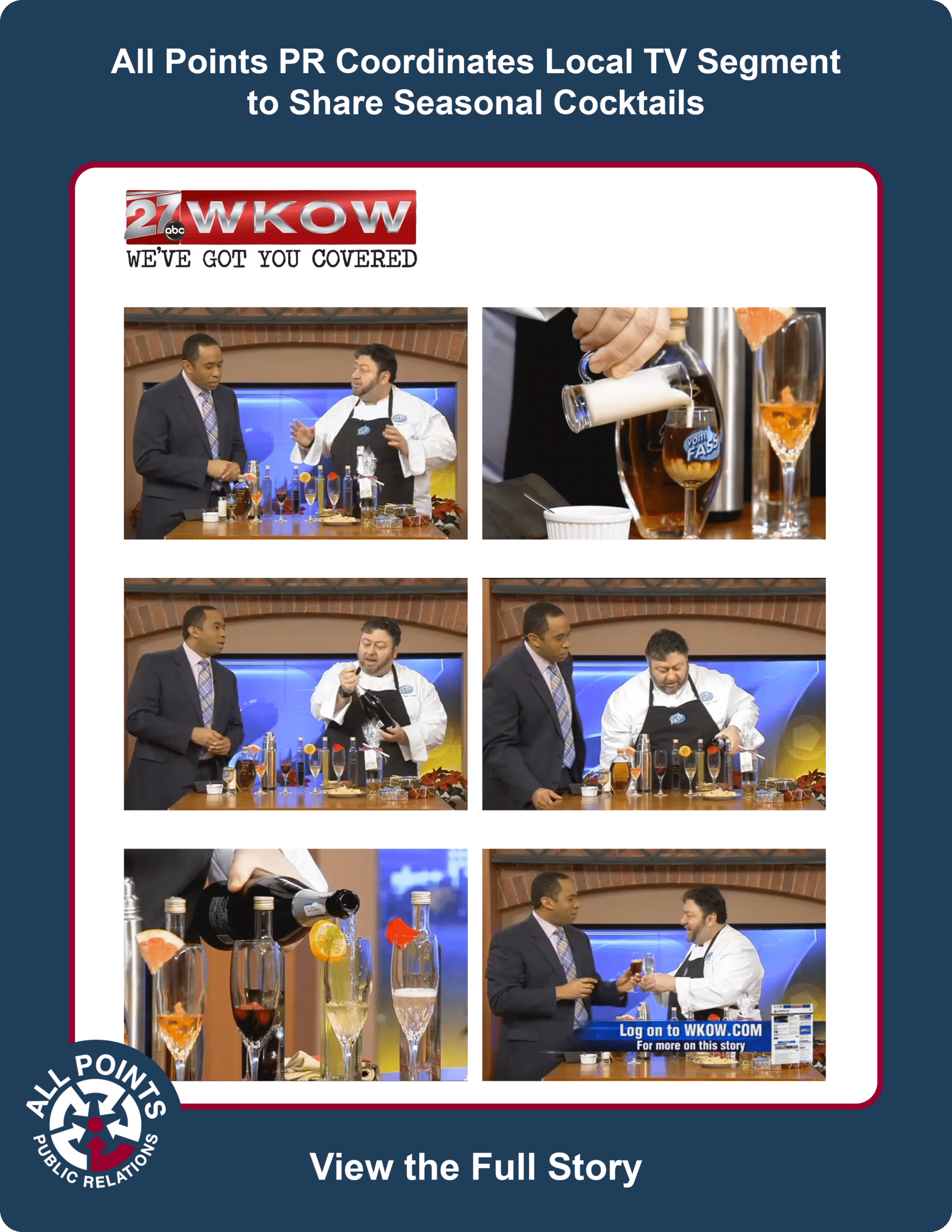 All Points PR coordinated a TV segment on WKOW for VOM FASS executive chef to share some seasonal cocktail recipes and demonstrate the proper way to safely open a champagne bottle. Coverage ran online and on air live.