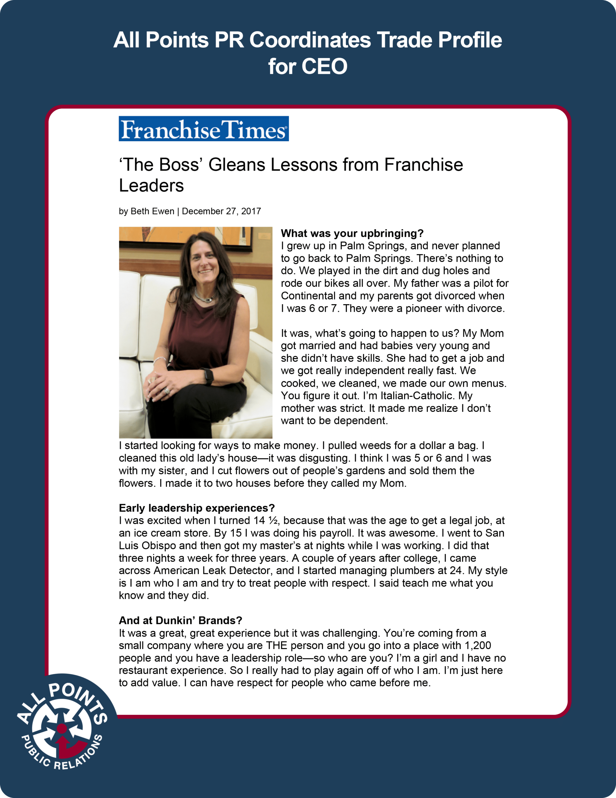 All Points PR coordinated a profile in Franchise Times for the CEO of Bottle & Bottega to discuss leadership lessons gleaned through years of experience. Coverage ran online.