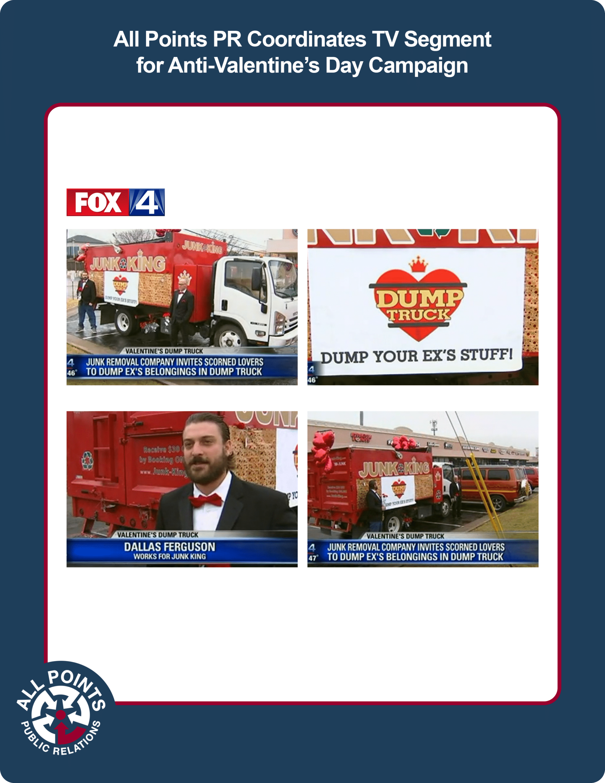 All Points PR coordinated a TV segment for Junk King’s creative Dump Truck campaign, where community members were invited to visit a parked Junk King truck and dump their exes’ stuff. Coverage ran on TV.