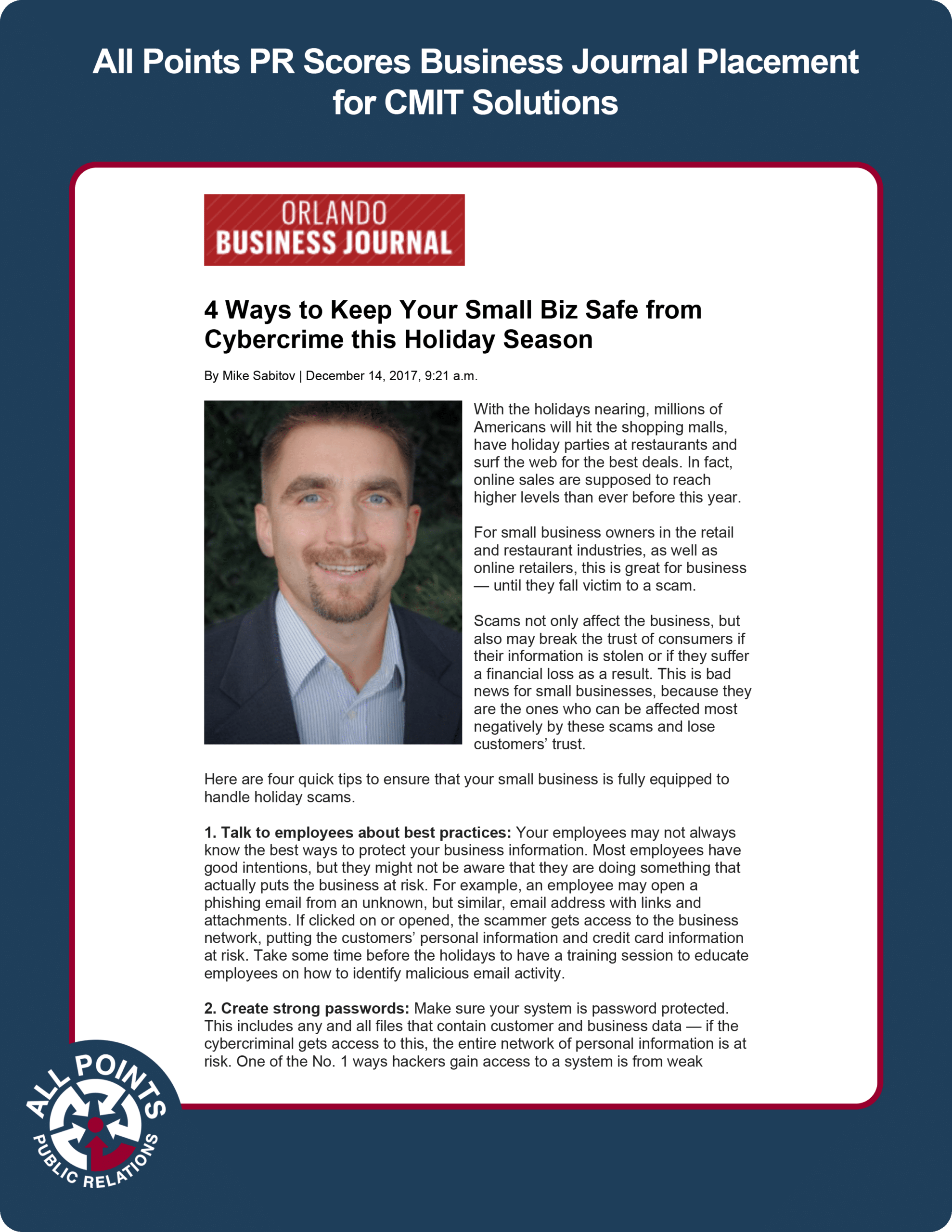 All Points PR secured a placement in the Orlando Business Journal for client CMIT Solutions to highlight the brand’s expertise on technology safety around the holidays. Coverage ran online.