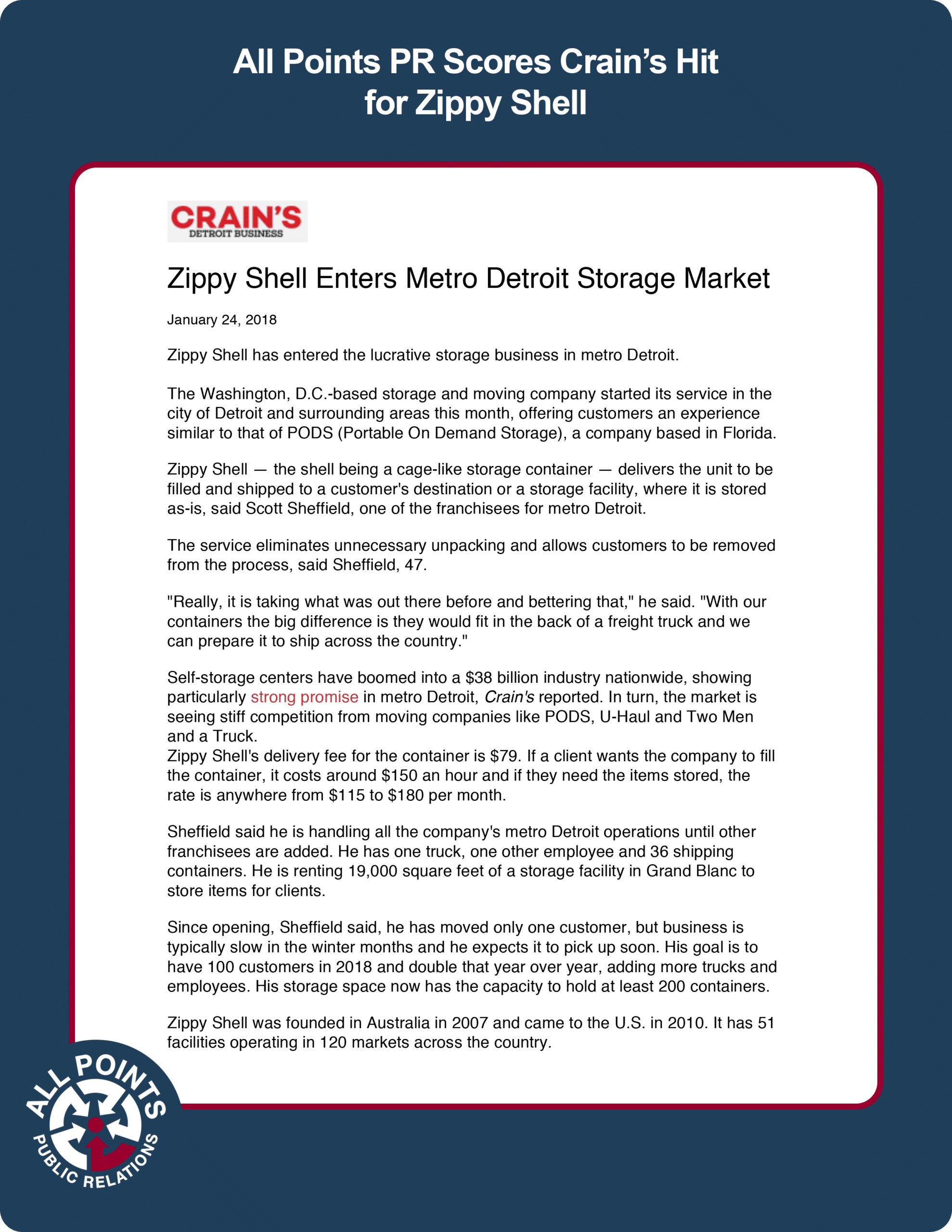 All Points PR coordinated a placement in Crain’s Detroit for Zippy Shell and its recent growth into the Detroit market, specifically about how it speaks to the strength of the moving and storage industries. Coverage ran online.