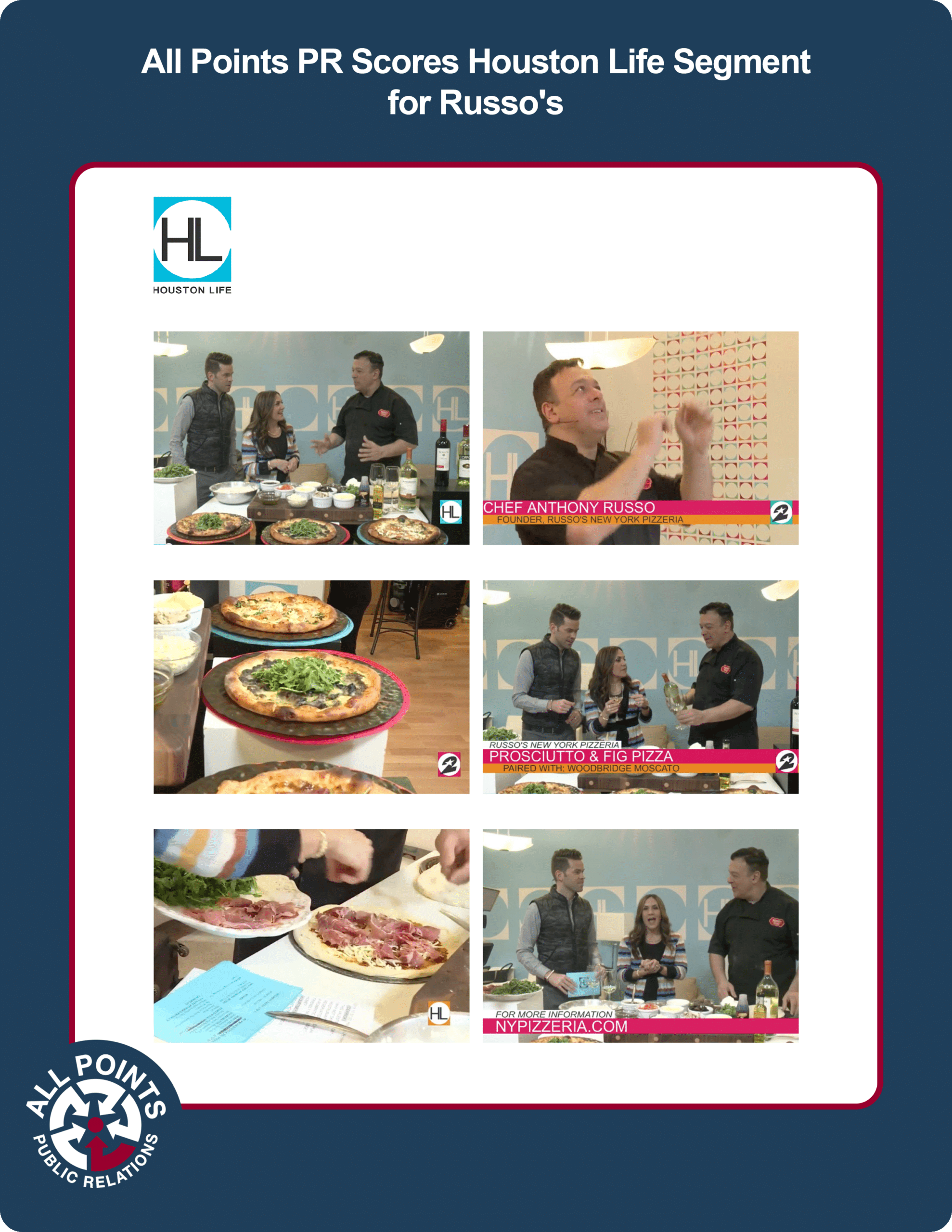 All Points PR secured a Houston Life segment for Russo’s Restaurants where CEO Anthony Russo went live on air, tossed some pizza dough and discussed the brand’s philanthropic efforts. Coverage ran live on air.