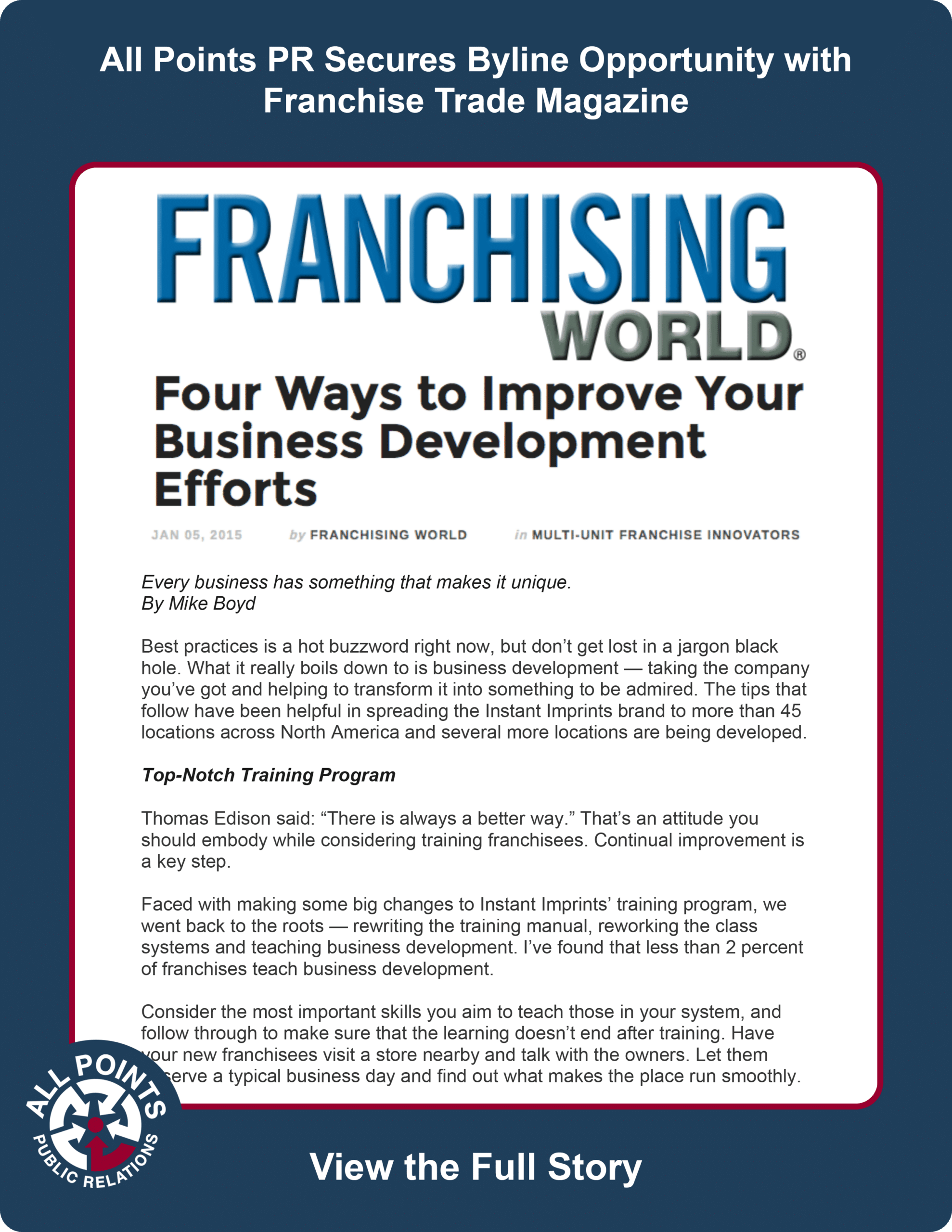 All Points PR coordinated a byline opportunity for a prominent executive team member at multi-national printing and marketing franchise Instant Imprints to showcase his exceptional skill set and inspire other small business owners to strive for success.