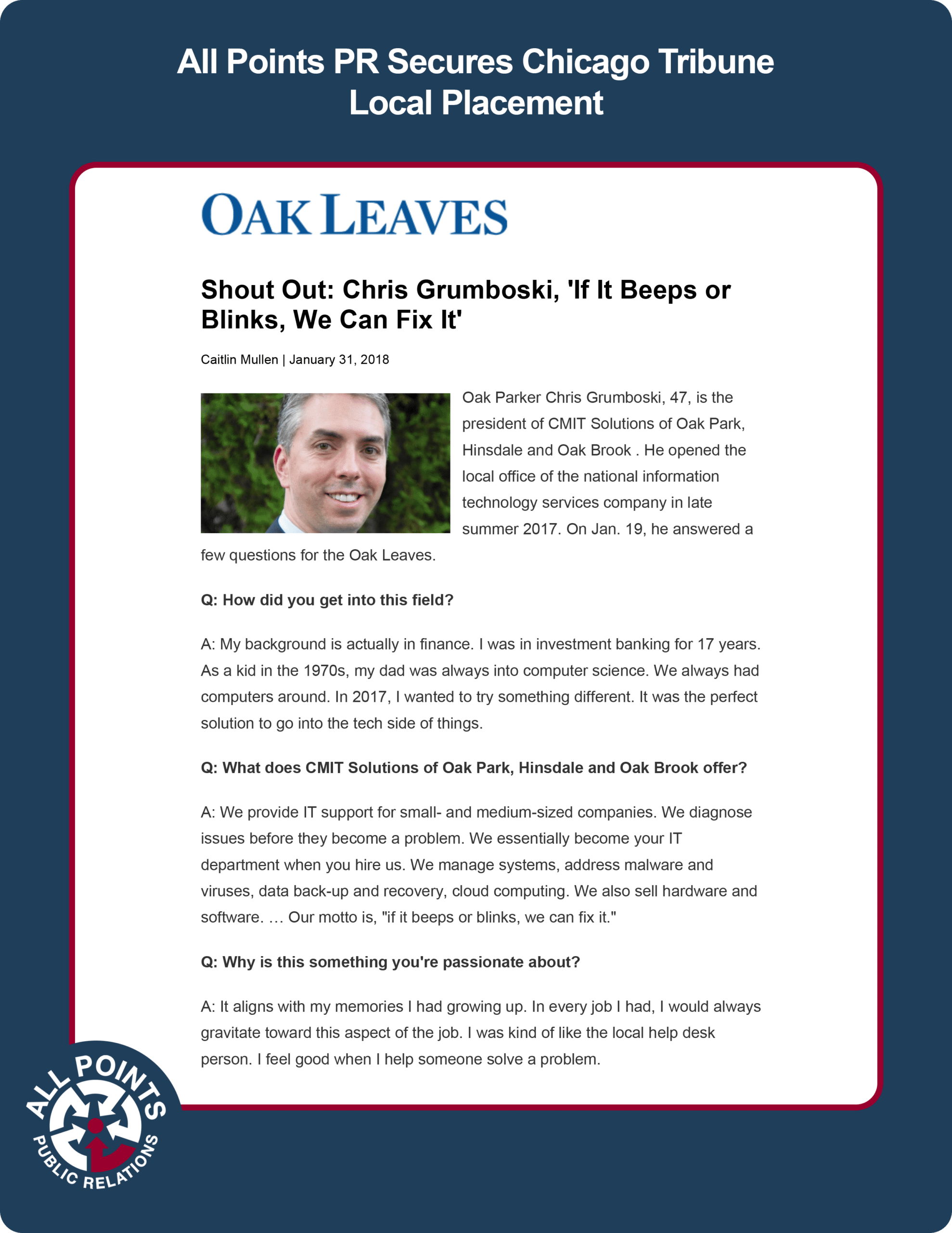 All Points PR secured a placement in a suburban edition of the Chicago Tribune on behalf of a CMIT Solutions franchisee. He gave a Q&A about his background, the services he provides and how he plans to serve the businesses in his community. Coverage ran online.