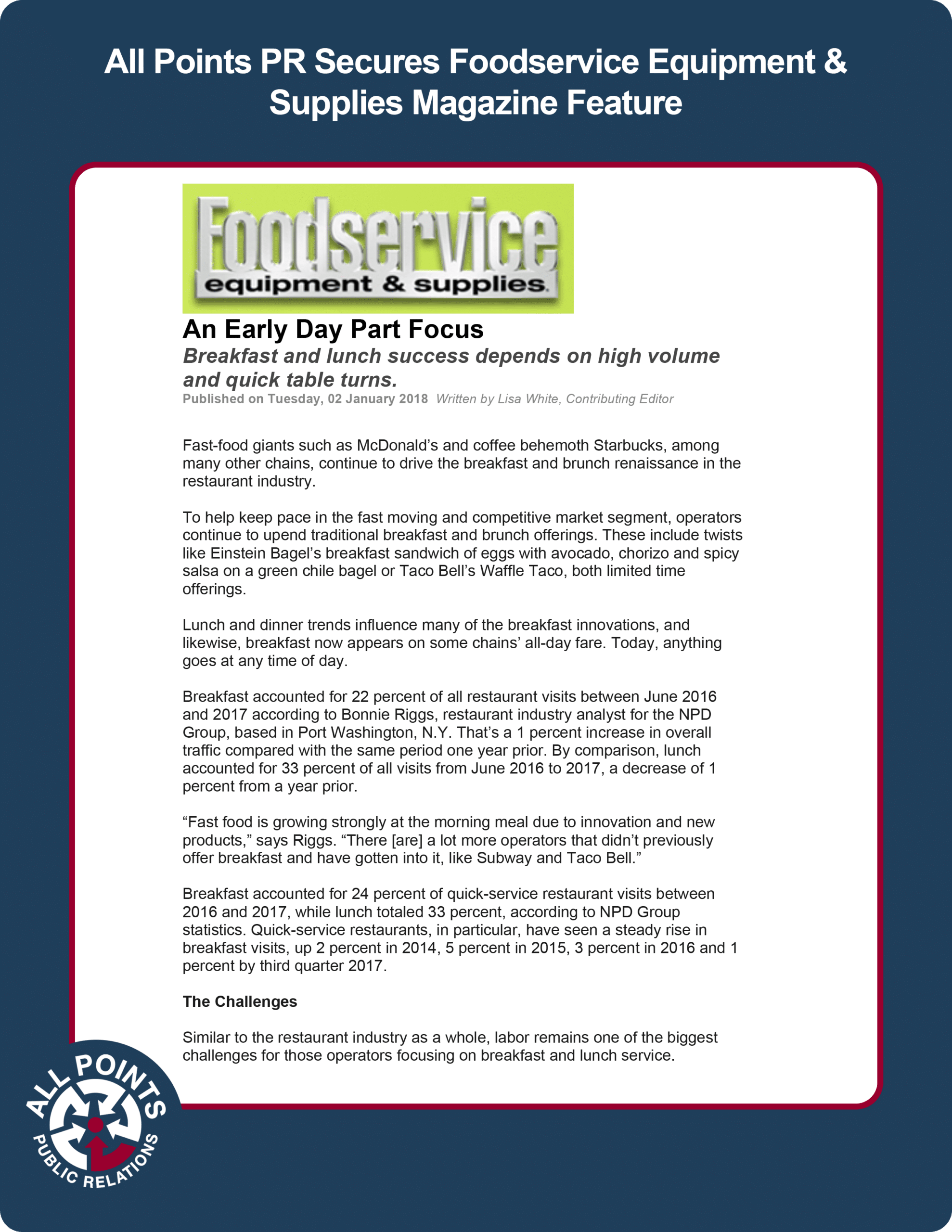 All Points PR Secures Foodservice Equipment & Supplies Magazine Feature