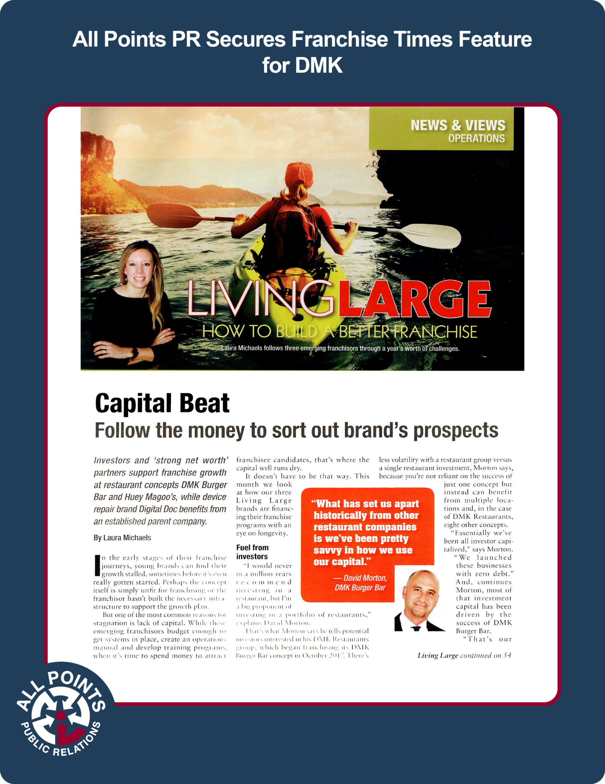 All Points PR secured a placement in Franchise Times that follows DMK Burger Bar\’s journey to franchise investment and how they use their capital. Coverage ran in print and online.