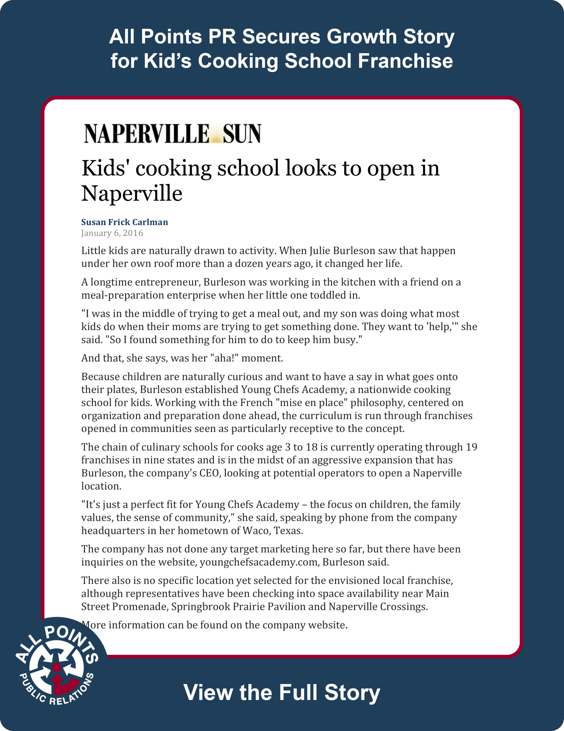 All Points PR secured a growth feature for client Young Chefs Academy in the Naperville Sun. The story was also posted to the Chicago Tribune, giving it greater exposure and sharing the story of the company, its philosophy and services with an even broader audience. Coverage ran online and in print.