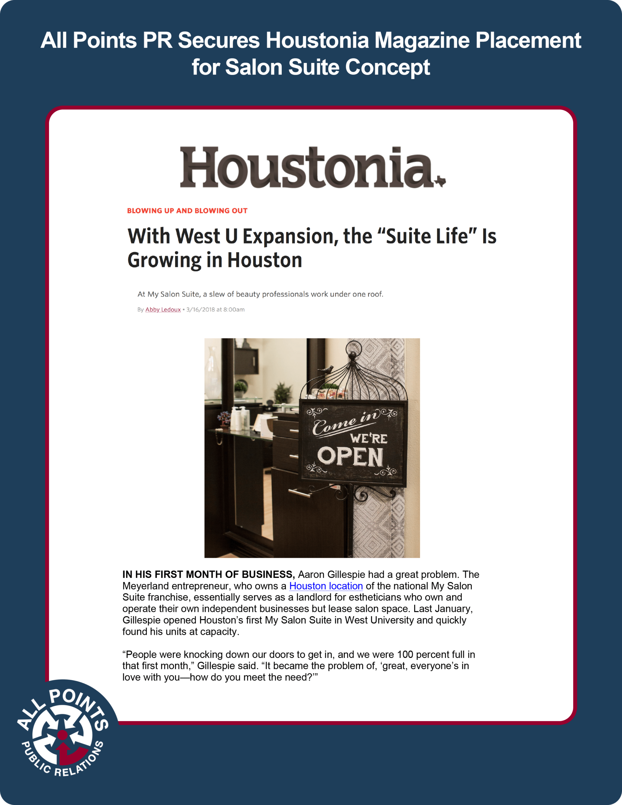All Points PR secured a placement in Houstonia Magazine for MY SALON Suite franchisee Aaron Gillaspie and his recent opening and expansion. The article featured several photos and great quotes, and ran online.