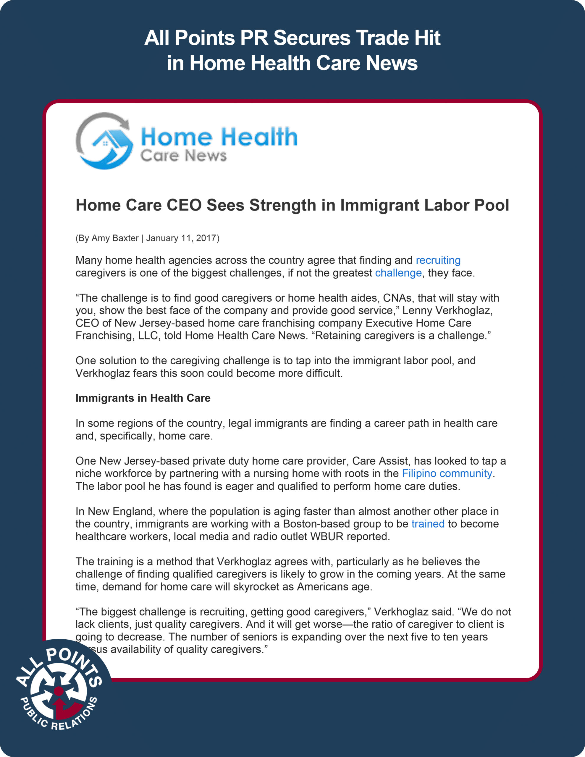 All Points PR secured a placement in Home Health Care News for client Executive Care. The brand appeared to share expert opinions on immigration reform in the home care industry. Coverage ran online.