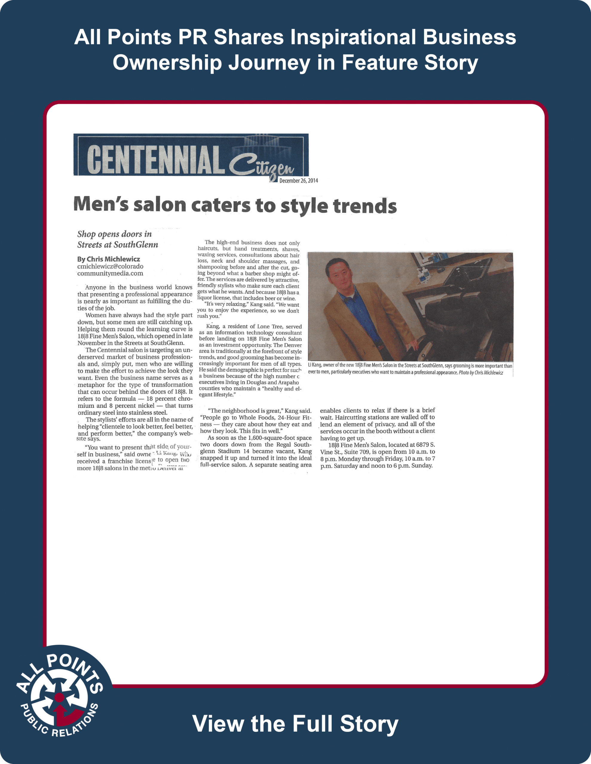 All Points PR secured a feature story in a local newspaper for men\’s luxury salon 18|8 to share a photo and an inspiration career change story from 18|8\’s latest franchisee. The story included a rundown on the services the salon provides and the impact it will have on the community.