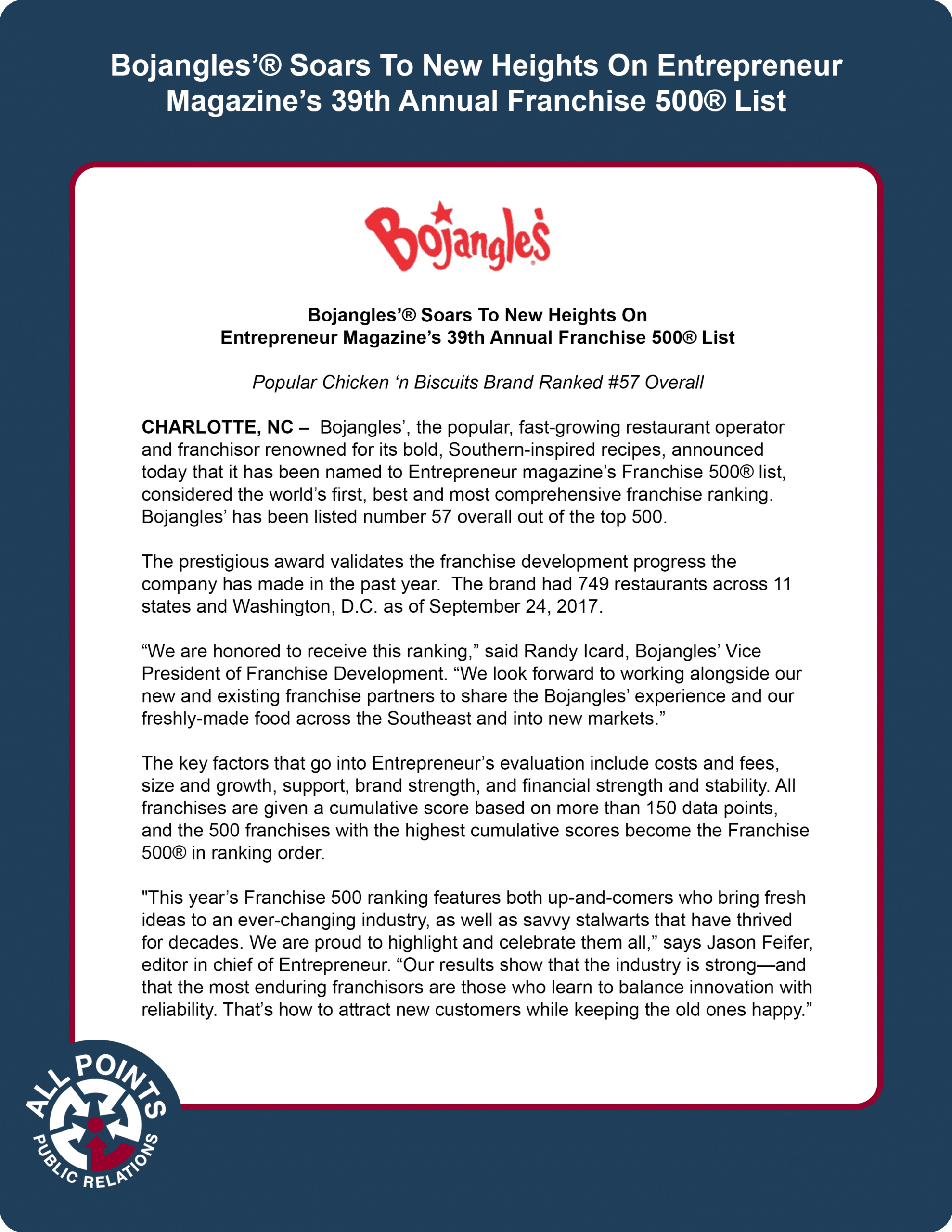 “We are honored to receive this ranking,” said Randy Icard, Bojangles’ Vice President of Franchise Development. “We look forward to working alongside our new and existing franchise partners to share the Bojangles’ experience and our freshly-made food across the Southeast and into new markets.”