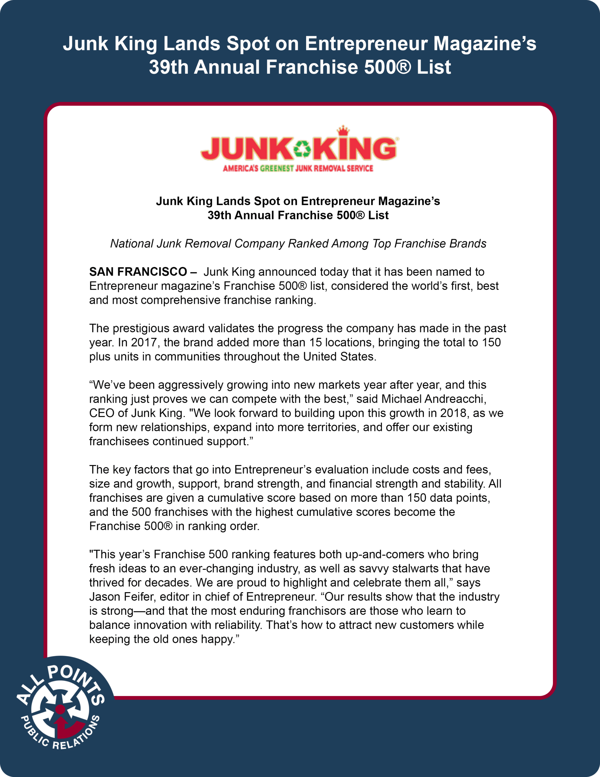 SAN FRANCISCO – Junk King announced today that it has been named to Entrepreneur magazine’s Franchise 500® list, considered the world’s first, best and most comprehensive franchise ranking.