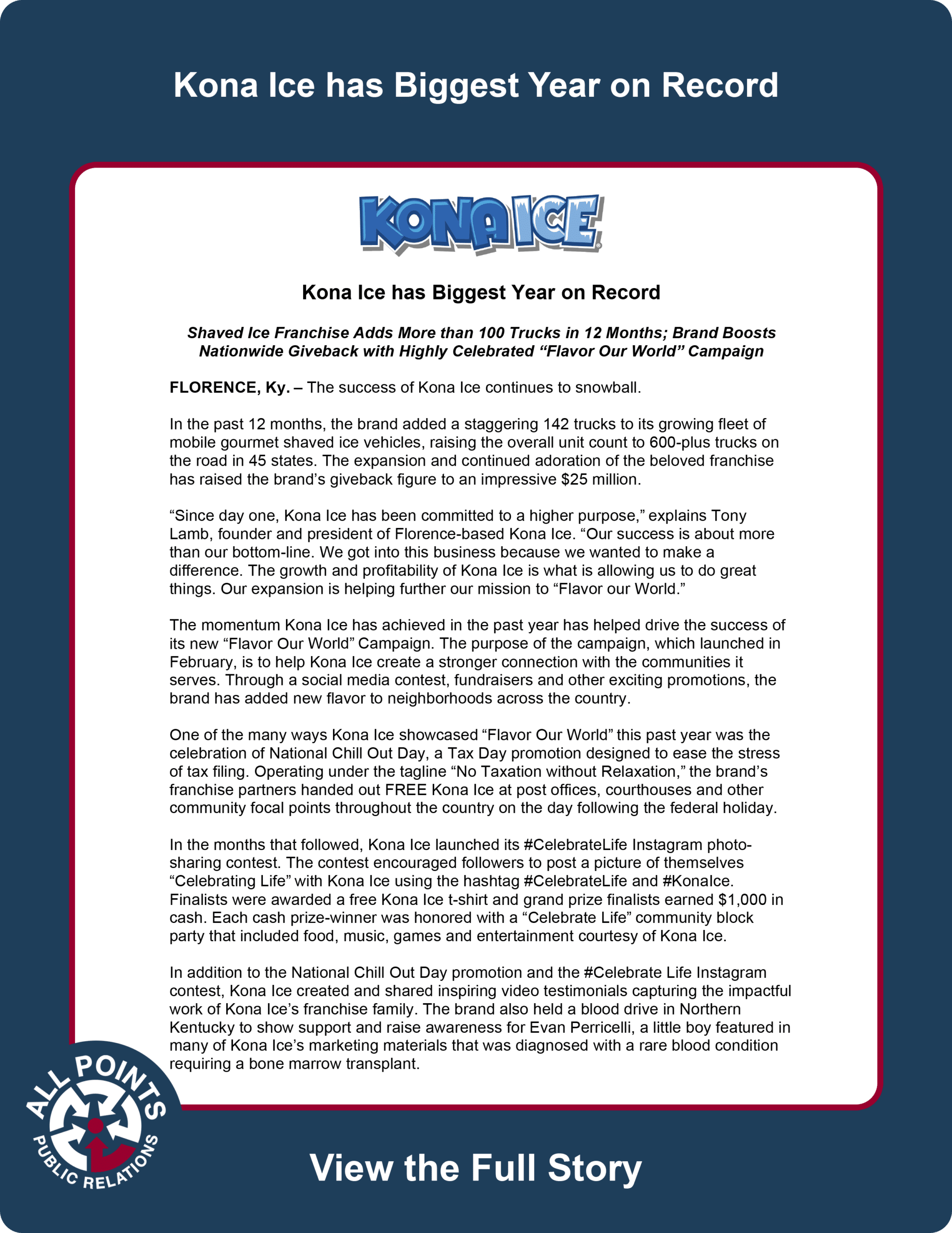 In addition to the National Chill Out Day promotion and the #Celebrate Life Instagram contest, Kona Ice created and shared inspiring video testimonials capturing the impactful work of Kona Ice’s franchise family. The brand also held a blood drive in Northern Kentucky to show support and raise awareness for Evan Perricelli, a little boy featured in many of Kona Ice’s marketing materials that was diagnosed with a rare blood condition requiring a bone marrow transplant.