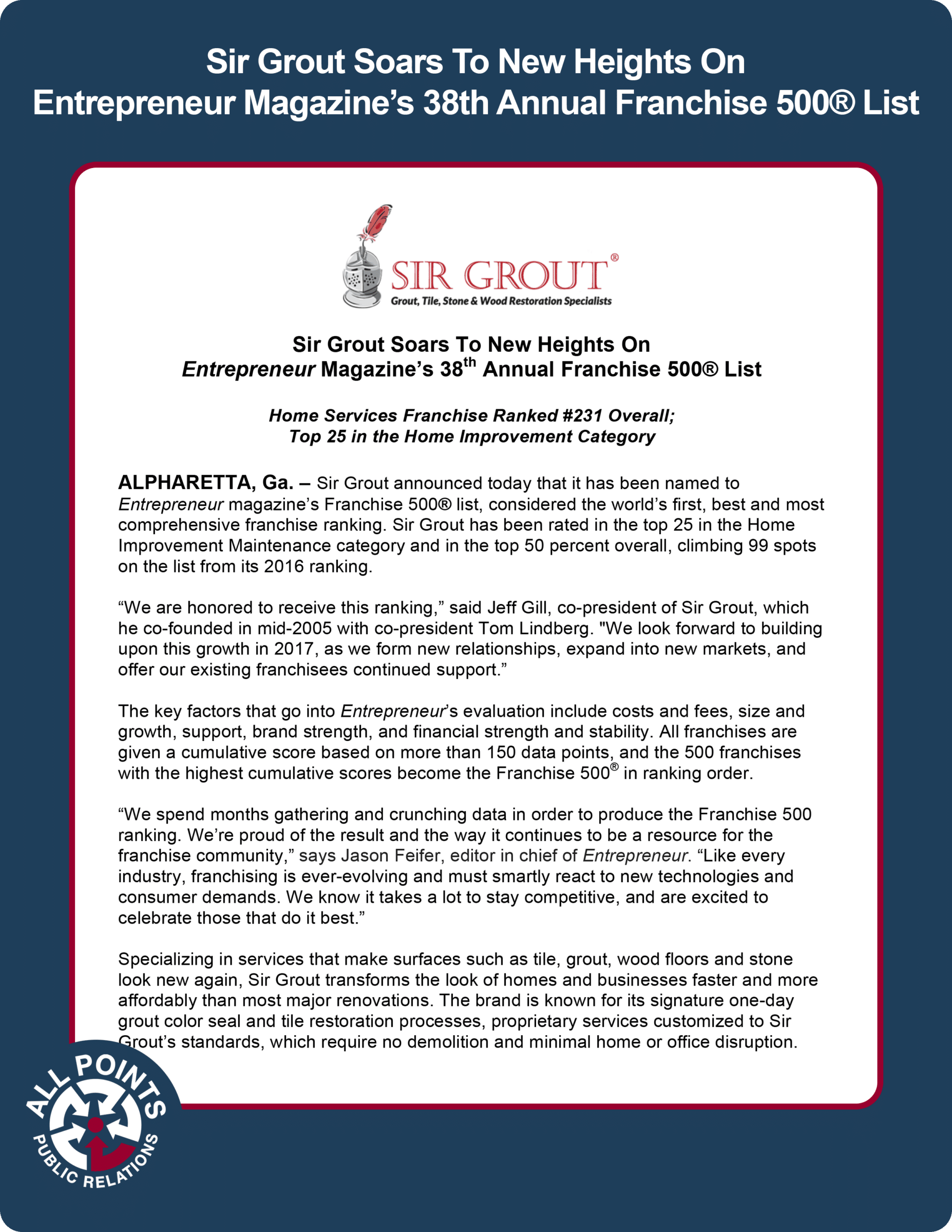 “We are honored to receive this ranking,” said Jeff Gill, co-president of Sir Grout, which he co-founded in mid-2005 with co-president Tom Lindberg. \”We look forward to building upon this growth in 2017, as we form new relationships, expand into new markets, and offer our existing franchisees continued support.”